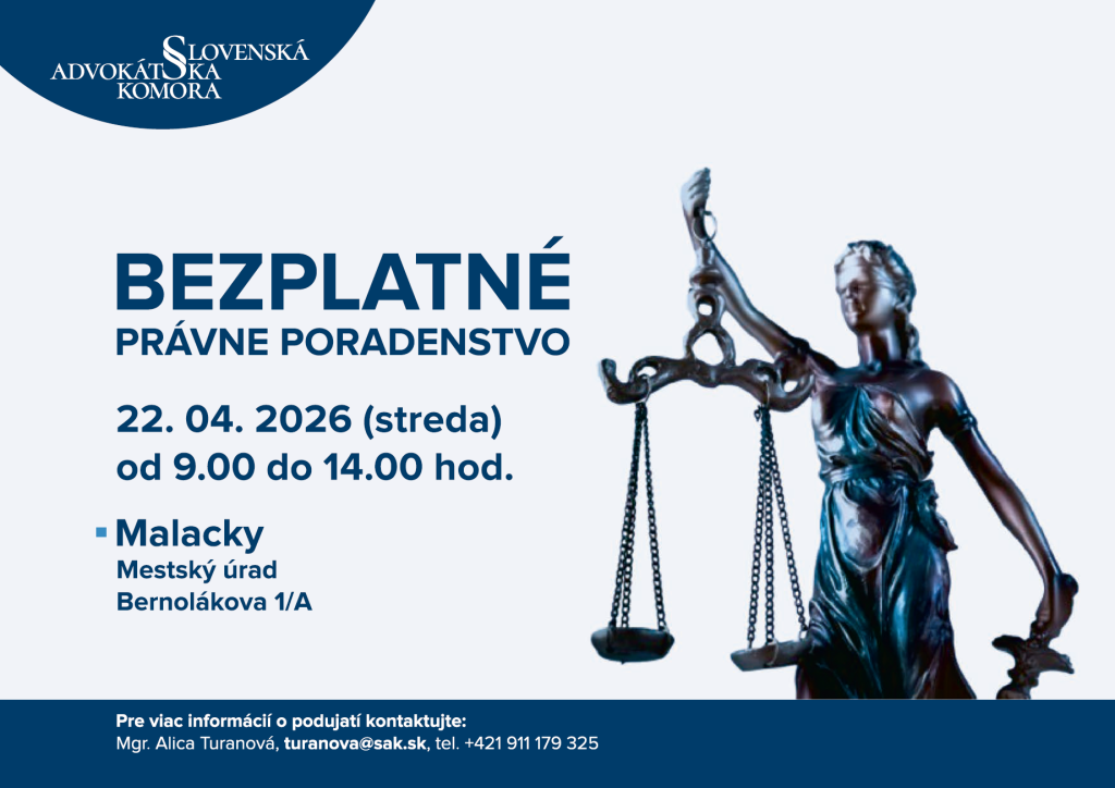 Slovenská advokátska komora (SAK) znovu pripravuje bezplatné právne poradenstvo pre všetkých. Advokáti budú k dispozícii všetkým záujemcom o právnu pomoc v stredu 22. apríla 2026 v 24 mestách po celom Slovensku vrátane Malaciek.