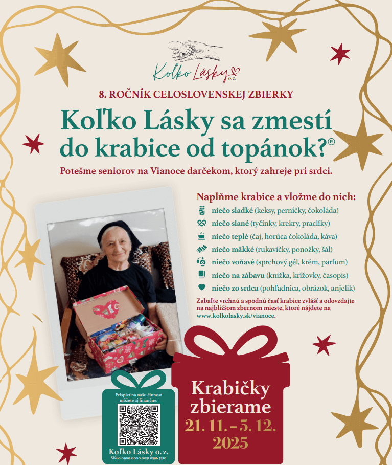 Aj tento rok sa koná celoslovenská zbierka pre seniorov v domovoch dôchodcov. Zapojiť sa môže každý, kto chce potešiť. Stačí k tomu krabica (napríklad od topánok), pár maličkostí a kúsok svojho srdca. Ďakujeme.