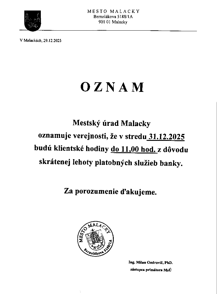 Mestský úrad Malacky oznamuje verejnosti, že v stredu 31. decembra 2025 budú klientské hodiny do 11.00 h z dôvodu skrátenej lehoty platobných služieb banky. Budova MsÚ a Inkubík budú v stredu 31. decembra otvorené do 16.00 h.