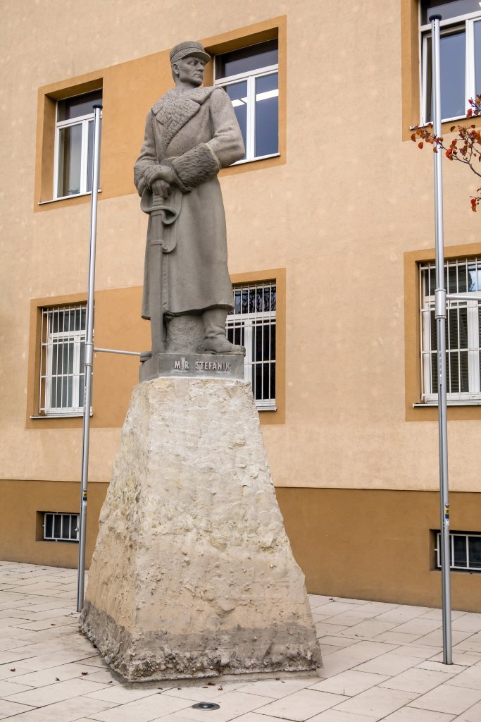 Socha M. R. Štefánika vznikla v roku 1943 v ateliéri akademického sochára Vojtecha Ihriského, ktorý je spoluautorom aj známeho sediaceho Hviezdoslava neďaleko Slovenského národného divadla v Bratislave. Odhalená bola v roku 1944. Generál, vytvorený z pieskovca, na vysokom podstavci, opierajúci sa o meč, však na svojom mieste neprežil ani 10 rokov. Po nástupe komunizmu sa okrem iného likvidovali aj Štefánikove sochy, a tak jedného dňa, pravdepodobne v roku 1953, zostalo priestranstvo v centre mesta prázdne. Časti sochy sa našli až na jeseň 2002 neďaleko svojho pôvodného miesta. Objavili ich robotníci pri výkopových prácach, keď sa začal stavať Inkubátor. Na verejnosť sa znovu dostal podstavec a časť trupu, avšak ramená a hlavu sa napriek veľkej snahe nepodarilo nájsť. Chýbajúce časti generála Štefánika nanovo vytvoril Juraj Gavula a obnovená socha bola slávnostne odhalená v apríli 2006.